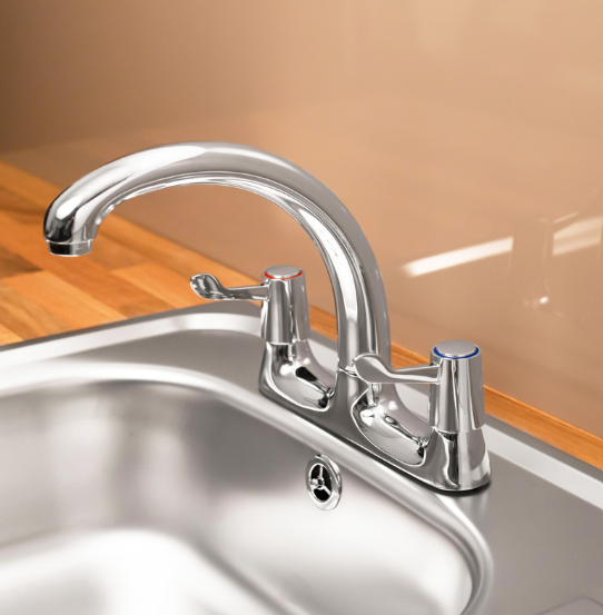 This kitchen mixer tap from Ebb+Flo features a polished chrome finish to complement the sturdy brass construction. With ½” ceramic disc valve operation via the modern, twin lever tap handles, water flows seamlessly from the swivelling, swan neck spout. Featuring easily identifiable hot and cold water selection, this kitchen tap is suitable for all water systems and pressures for smooth, quiet function and high flow rates, and is WRAS approved.