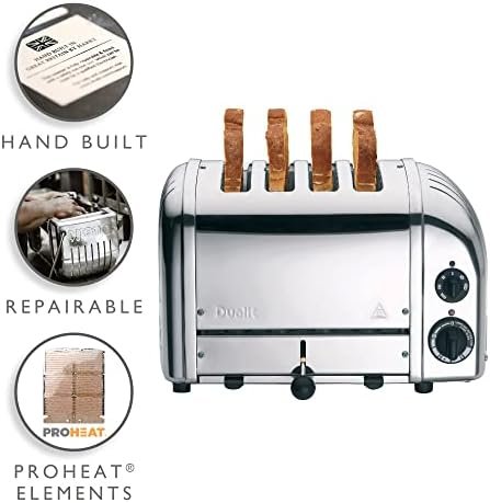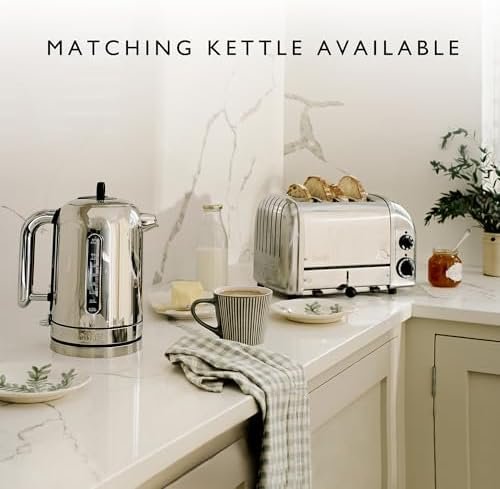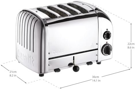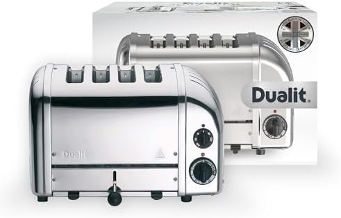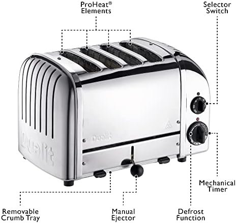 The Dualit Classic Toaster combines simplicity and sophistication ideally. It features extra-wide 28 mm slots to accommodate a sandwich cage. ProHeat elements increase toasting efficiency and element longevity. The toaster has a removable crumb tray and an adjustable rear foot. Manually operated, the Dualit toaster features a dial to control the degree of browning. This allows you to enjoy your toast exactly the way you like it. An ejector system means that the toast does not pop up but stays warm until the ejector lever is pushed up. It can be set to toast however many slices you wish and has a handy bagel function to toast one side whilst warming the other. Each of these toasters is assembled by hand and the assembler’s individual mark can be found on the base plate.