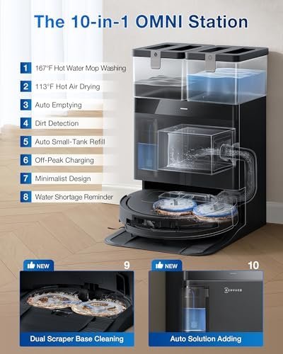 10-IN-1 OMNI STATION – HANDS-FREE MAINTENANCE—The OMNI Station handles all maintenance—167°F hot water mop washing, 113°F hot air drying, auto dustbin emptying, water refilling, and dirt detection. It even auto-dispenses cleaning solution, ensuring a deep, hands-free clean every time.