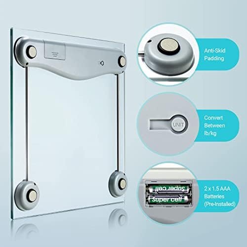Reliable readings in an instant—step on the auto-calibrated platform and receive accurate measurements in pounds or kilograms, weigh up to 400 lb. (180 kg) precision built with 4 high-precision sensors, delivering results with a 0. 2 lb. / 3 oz. Accuracy resolution cleanly displayed on an easy-to-read lcd screen tempered strength: Built with a thick and durable 6 mm clear tempered glass platform resilient enough to provide years of fitness tracking