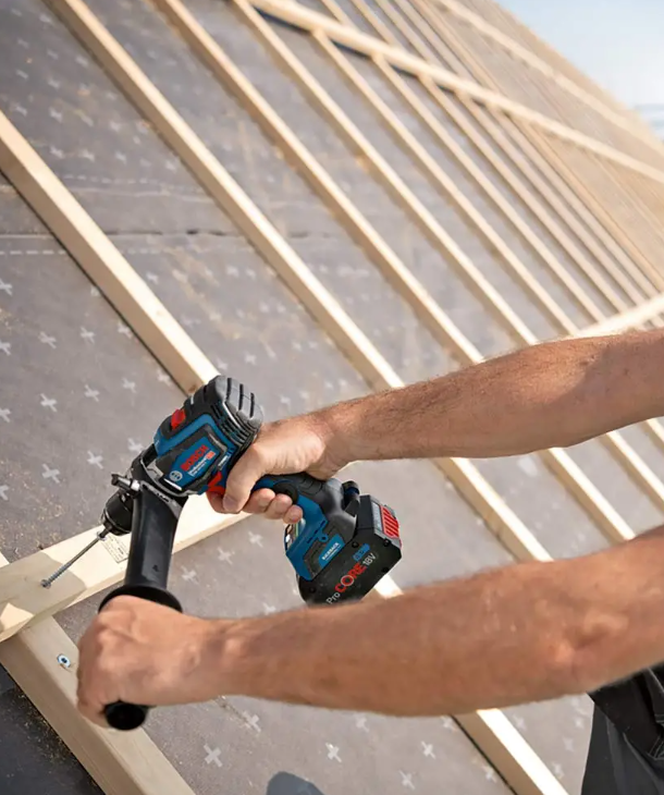 Delivering unrivalled power with 150Nm and 2,200 rpm maximizing efficiency on the job site, the 150Nm BITURBO Hammer Drill is known to be the world’s strongest drill. It has combined power from both ProCore18V 8.0ah & 12.0ah batteries and a new power Brushless motor. The GSB 18V-150 C has switchable kickback control which reduces the risk of sudden rotational torque reaction and allows for perfect tool control. The 150Nm Hammer Drill includes a two speed metal gearbox for fast drilling and driving applications, and Rapid Mode Selection for precise screw driving. Alongside electronic angle detection to ensure long screws are always in the right angle for sloper surfaces.