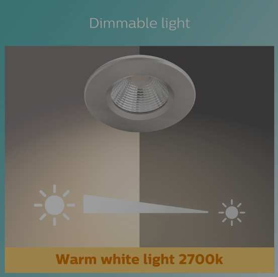 Create the perfect mood with Philips LED Dimmable recessed spots, you can easily dim your lights from everyday bright light to cosy tones.
