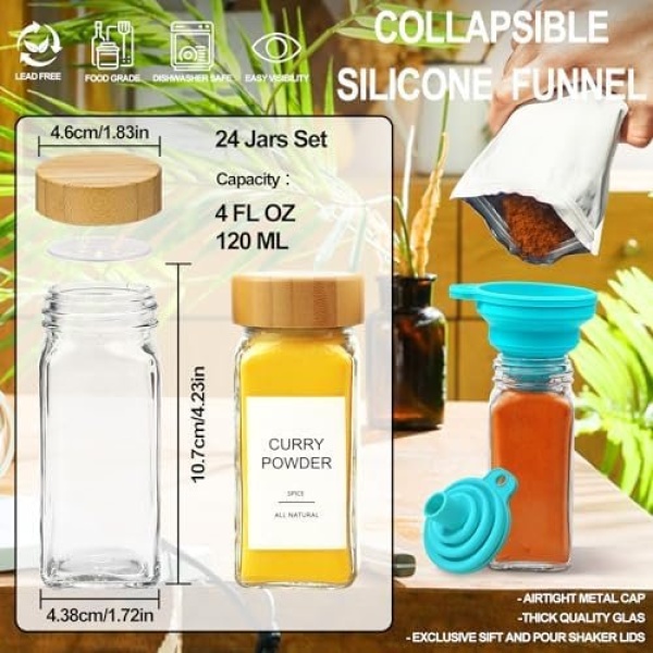 AISIPRIN 24 Pcs Glass Spice Jars with Bamboo Airtight Lids and 398 Labels, 4oz